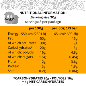 Delicious silky, rich flavour guilt-free bar. Hand crafted with carefully selected, Peruvian and Colombian beans. Inspired by keto, created with passion.