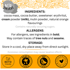 Ingredients: cocoa mass, cocoa butter, erythritol, cream powder(milk), inulin powder, natural orange flavouring