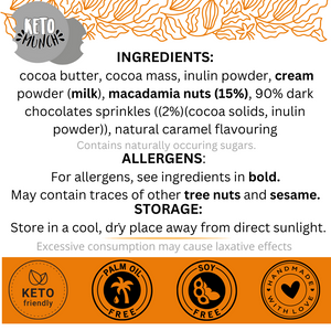 Ingredients: cocoa butter, cocoa mass, erythritol, cream powder(milk), inulin powder, macadamia nuts (15%), 90% dark chocolate sprinkles((2%)(cocoa solids, inulin powder)), natural caramel flavouring